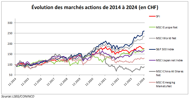 Historiquement, la domination américaine s’est principalement reflétée dans les marchés financiers grâce notamment au rôle quasi universel joué par le dollar. Après quelques années de doutes liés notamment aux difficultés survenues lors de la crise immobilière de 2008-2009, la puissance financière américaine s’est progressivement réimposée. Après des années de baisse relative, le dollar s’est stabilisé et la dette américaine n’a eu aucun mal à trouver preneur malgré sa continuelle accumulation. Mais c’est surtout sur le marché des actions où la confiance retrouvée a été la plus flagrante. Sur les dix années précédant 2025, le marché américain a largement surperformé toutes les autres principales places boursières. Il est intéressant de relever que les actions chinoises ont même connu une baisse sensible sur la période alors même que le poids économique de la Chine n’a cessé de croître.