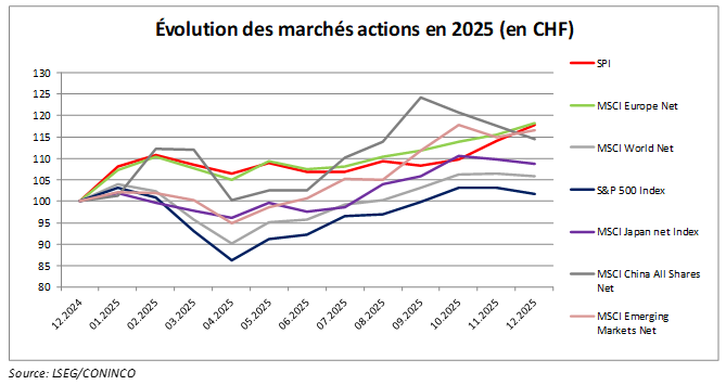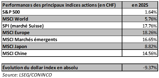 Les résultats de la seule année 2025 ont été tout le contraire des années précédentes. En 2025, une fois converti en CHF, le marché boursier américain a essentiellement fait du surplace (+1,65% pour le S&P 500), tandis que la plupart des autres marchés sont fortement montés. Par exemple, 18,26% pour l’Europe (Indice MSCI Europe net, en CHF), 17,76% pour la Suisse (Indice SPI, en CHF), 16,65% pour les marchés émergents (Indice MSCI World Net, en CHF), etc. En fait, aucun marché actions majeur n’a fait moins bien que les États-Unis en 2025, en CHF.